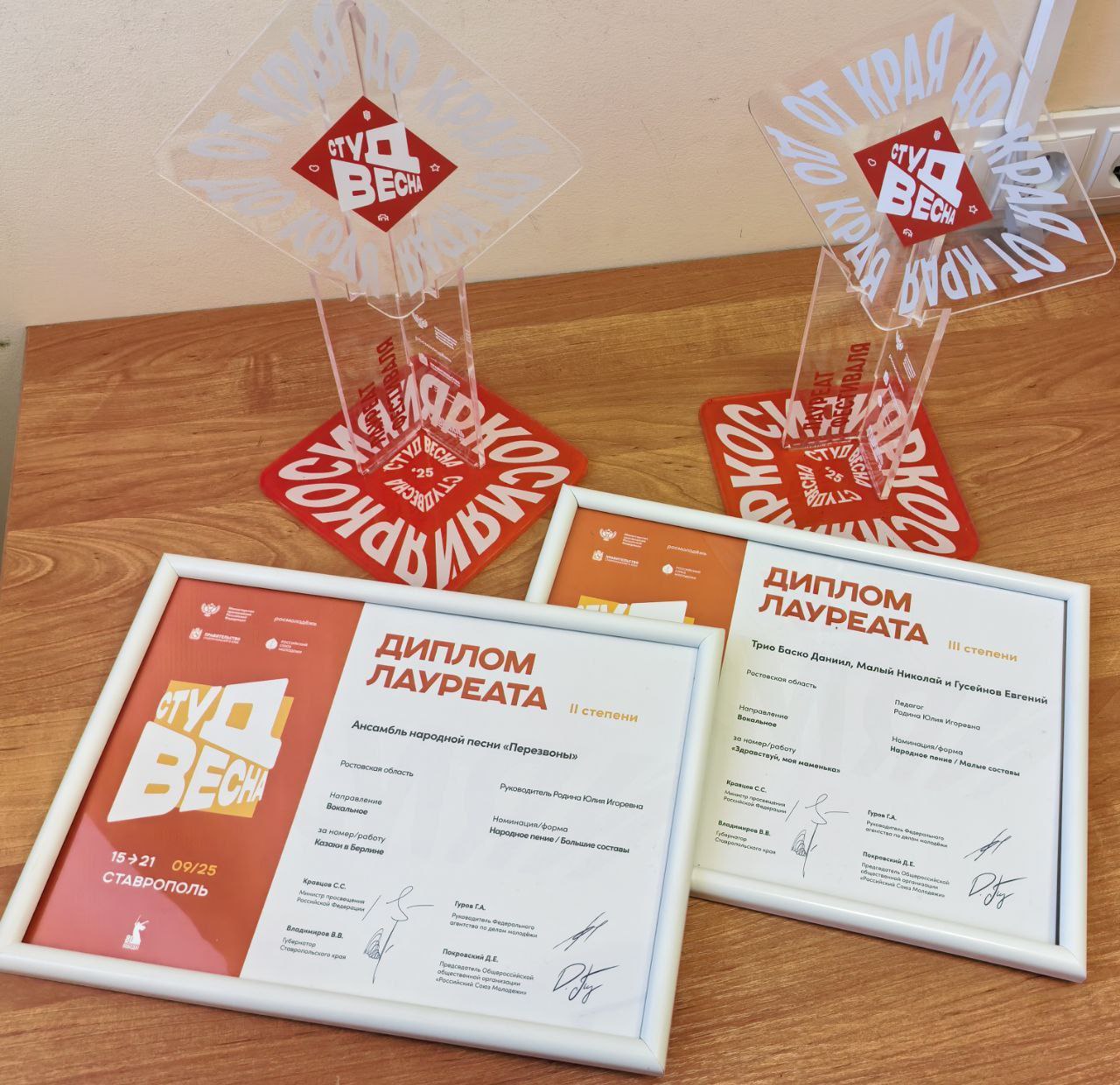 На Ставрополье завершился всероссийский фестиваль «Студенческая весна»! Студенты специальности «Сольное и хоровое народное пение» стали лауреатами в двух номинациях, достойно представив Ростовскую область. Лауреатом 2 степени в номинации «Народное пение/большие составы» стал ансамбль народной песни «Перезвоны», руководитель Ю. И. Родина. Лауреатом 3 степени в номинации «Народное пение/малые составы» - Трио Баско Даниил, Малый Николай, Гусейнов Евгений, руководитель Ю. И. Родина. Поздравляем с высокими наградами! | |