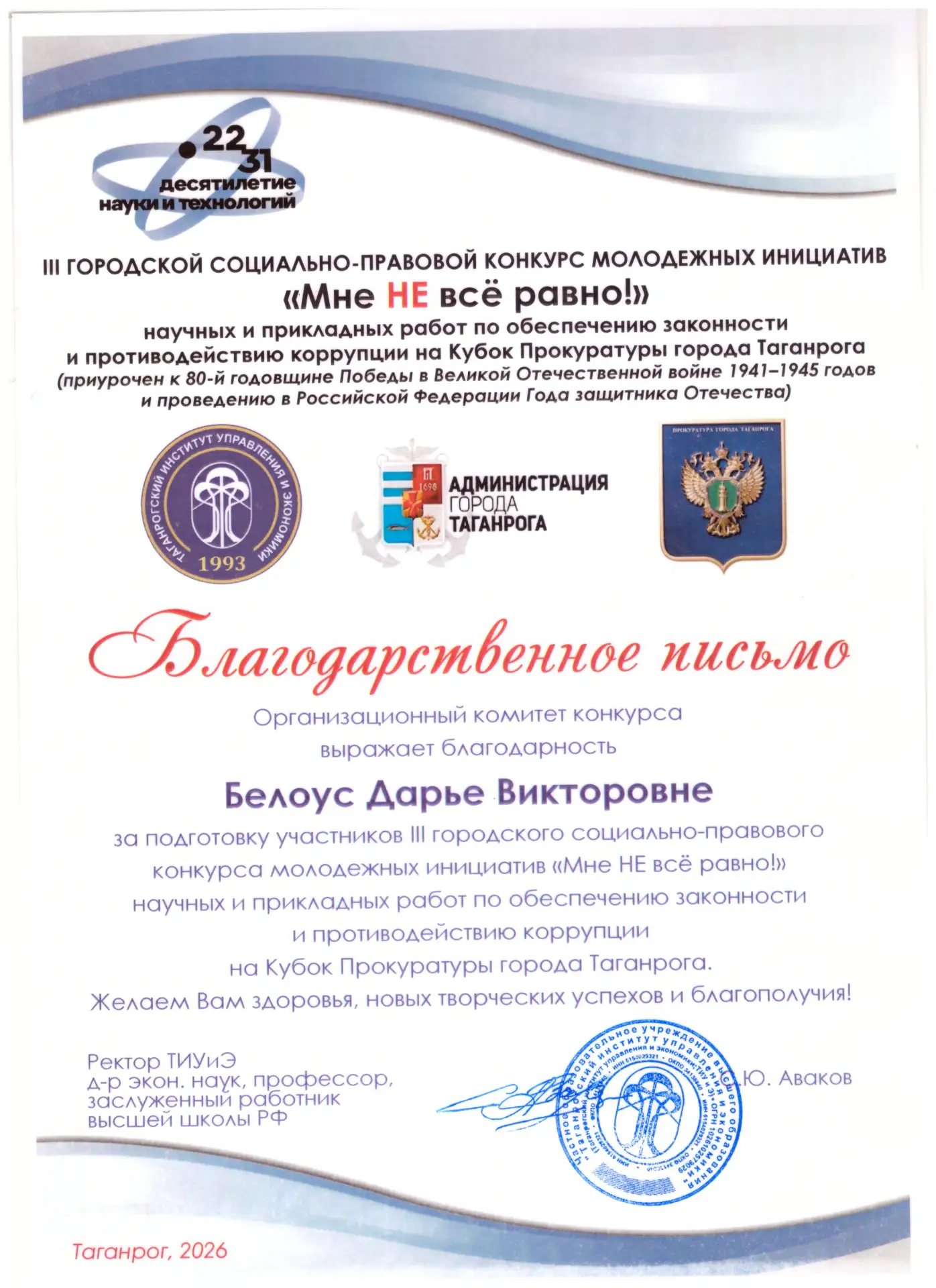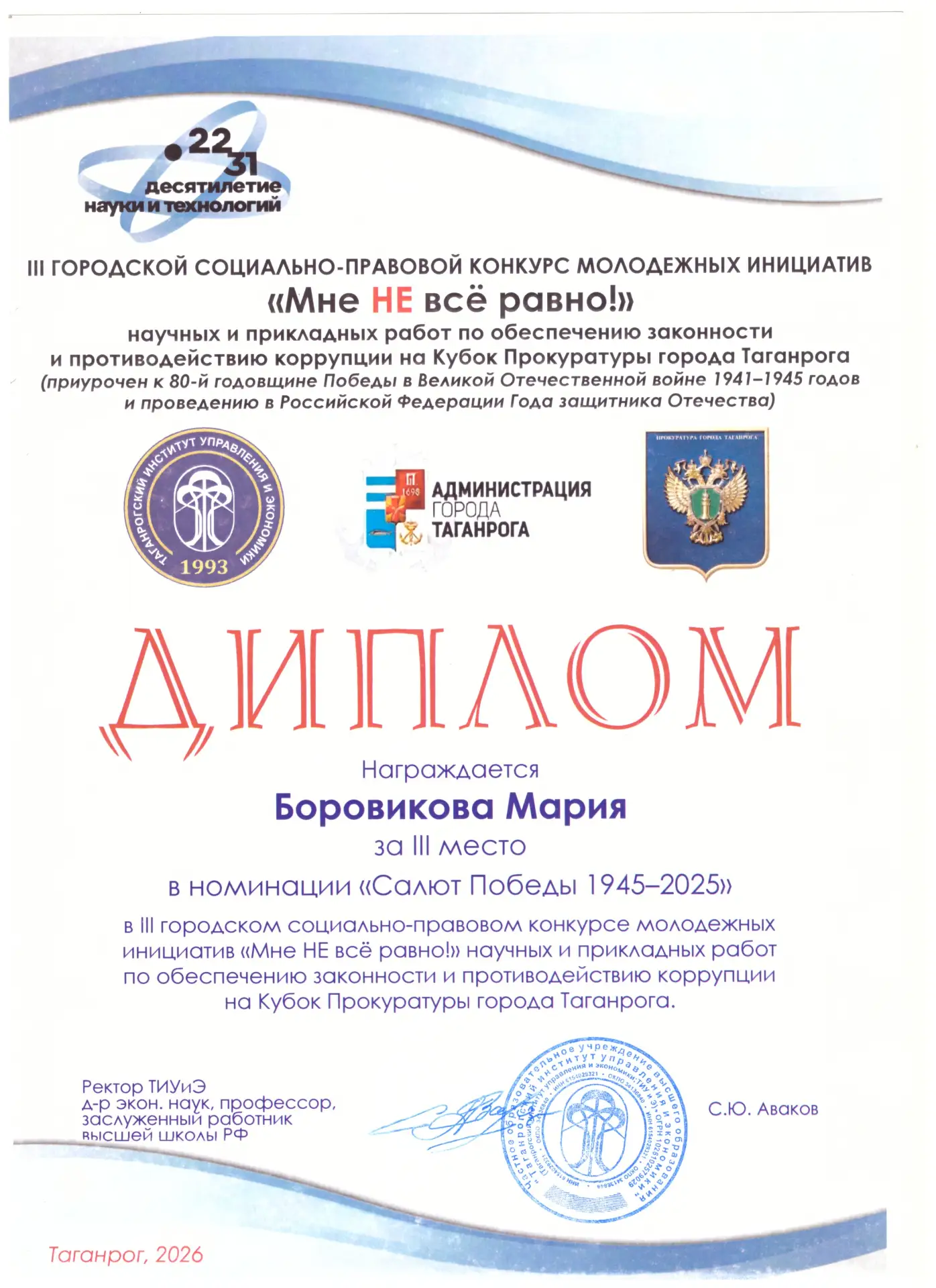 21 января 2026 г. в Таганрогском институте управления и экономики состоялась торжественная церемония награждения победителей и призеров III городского социально-правового конкурса молодежных инициатив «Мне НЕ всё равно!» научных и прикладных работ по обеспечению законности и противодействию коррупции на Кубок Прокуратуры города Таганрога (приурочен к 80-й годовщине Победы в Великой Отечественной войне 1941–1945 годов и проведению в Российской Федерации Года защитника Отечества). В конкурсе приняли участие студентки ГБПОУ РО «Таганрогский музыкальный колледж». | |