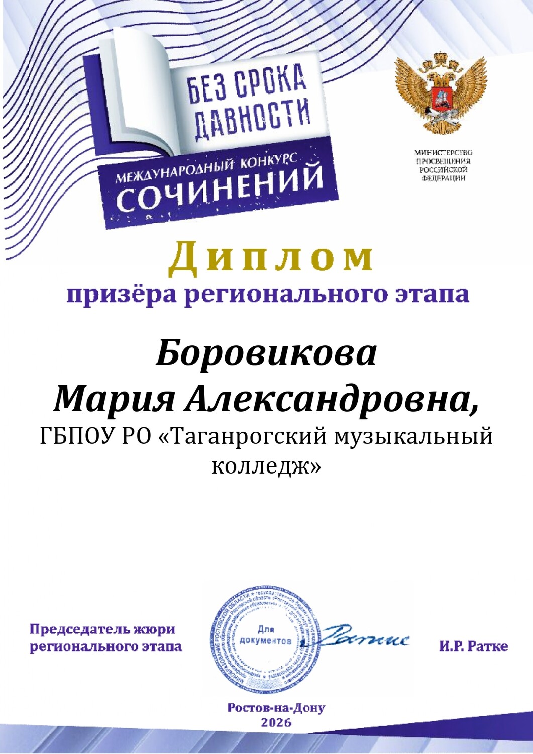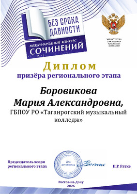 Боровикова Мария Александровна, студентка 1 курса Таганрогского музыкального колледжа ПЦК «Эстрадное пение», под руководством советника директора по воспитанию Белоус Д.В. приняла участие в Международном конкурсе сочинений «Без срока давности». Цель проекта — сохранение исторической памяти о трагедии мирного населения СССР — жертв военных преступлений нацистов и их пособников в период Великой Отечественной войны. По итогам проведения регионального этапа Международного конкурса сочинений «Без срока давности» 2025/26 учебного года Мария получила диплом призёра. | |